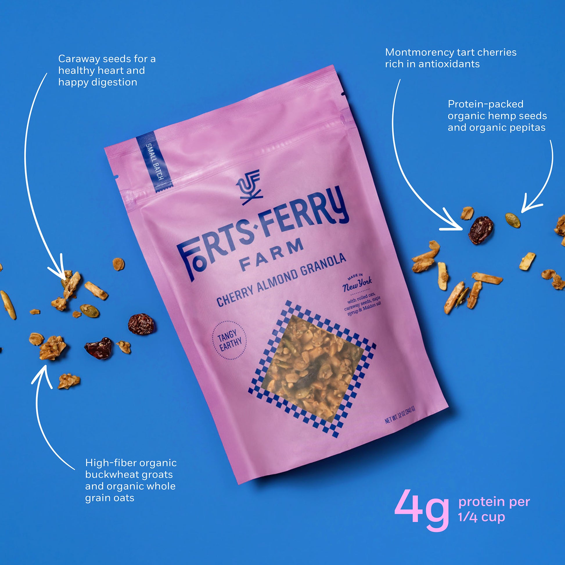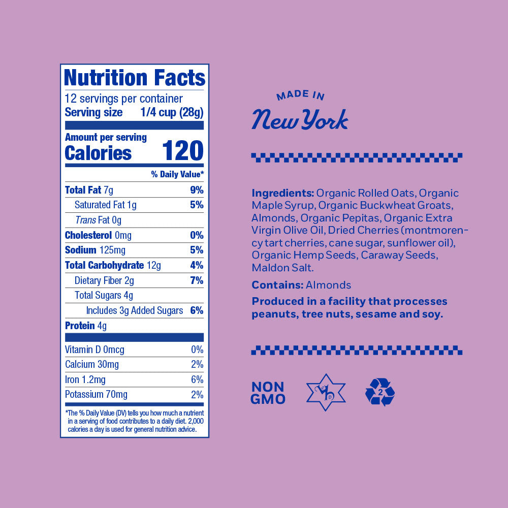 Say hello to your newest obsession. Our Cherry Almond granola is the perfect balance of sweet, savory, and spice with pops of Montmorency tart cherry, toasted slivered almonds, organic buckwheat groats, and pepitas. Emma Hearst's own chef-developed recipe uses only the finest extra virgin olive oil and maple syrup, yielding a luxurious mouth-feel with fabulous flavor that's highly addictive. Dress it with milk to start the most perfect day. Sprinkle over ice cream for a divine indulgence. Snack on it by the fistful whilst scaling a mighty mountain! It's satisfying, slightly salty crunch keeps everyone coming back for more.